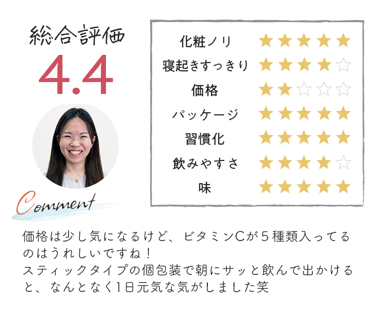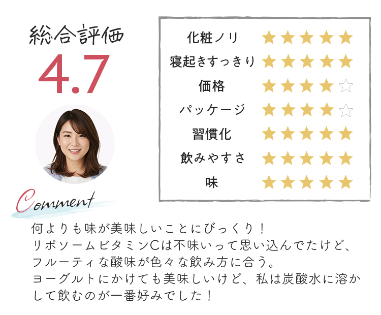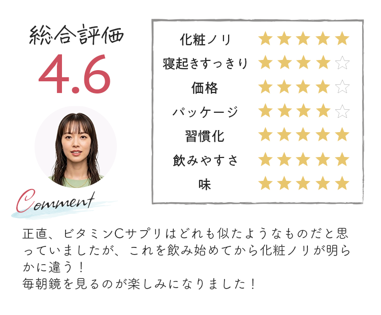 ビタミンCを5種類も配合している点が特長ですが、ただ種類が多いだけでなく、ビタミンCそれぞれの得意分野が活きるように設計されている点が高評価でした。