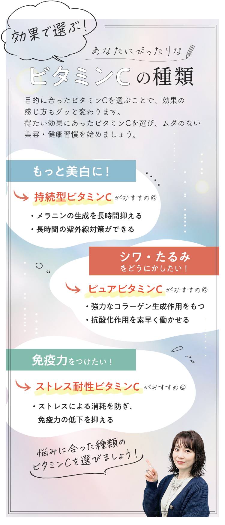 ビタミンCは、種類によって体感や働き方が異なります。
